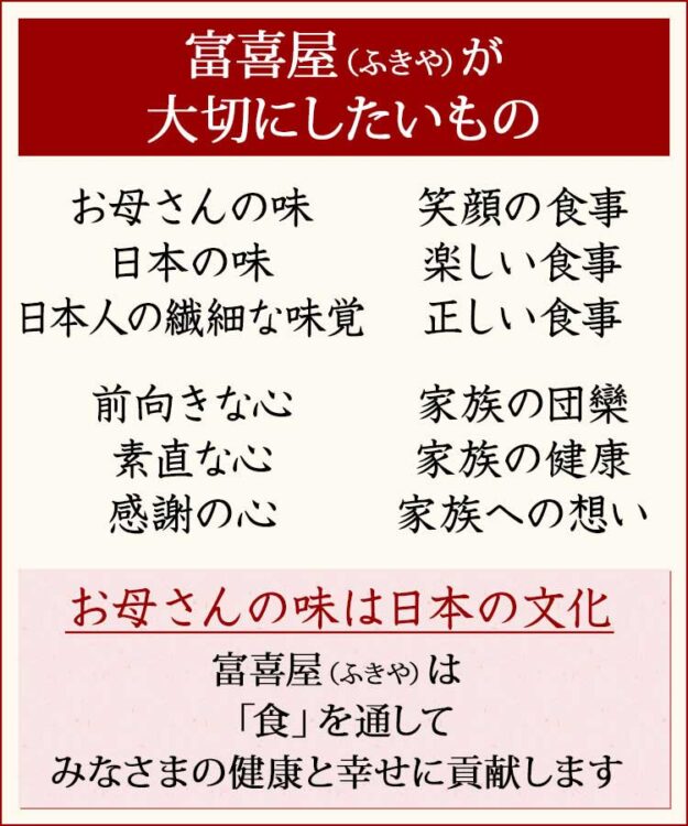 富喜屋は伝統的な日本の食文化である「お母さんの味」を大切にします