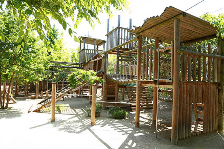 都内にありながら3メートルの高さの築山や滝、川、ジャブジャブ池にビオトープなど充実した園庭をもつ葛飾二葉幼稚園さま。