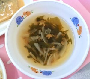 でも・・・・骨付きのお魚もご家庭でしっかり見守りながら練習ができると良いですね。付け合わせはミネラルと食物繊維がたっぷりのひじきの煮物、粘膜や皮膚を守ってくれるカロテンが豊富に含まれたインゲンの和え物です。