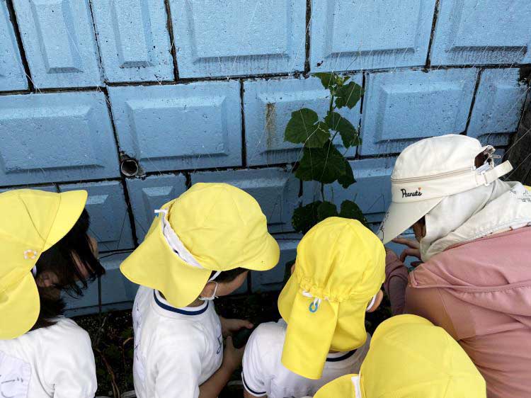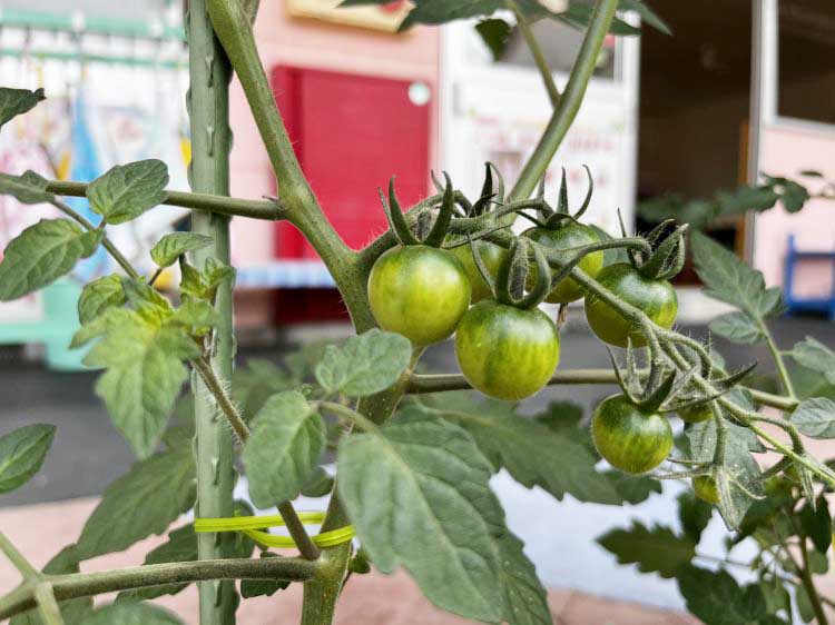 イモの苗を植えて観察したり、トマトやキュウリを育てたりしています。大きさを測って「そろそろ食べごろかな?」と判断して、収穫する活動も行っています。